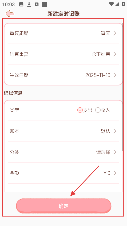 4、在新建定时记账页面,设置重复周期、记账信息等,点击【确定】,可完成定时记账设置哦。
