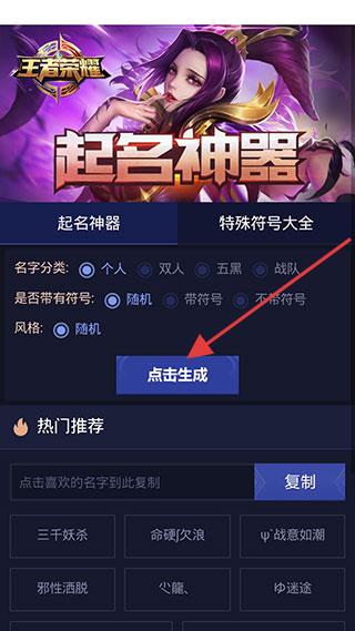 2、在对应游戏分类页面,设置【名字分类】等选项,点击【点击生成】获取名字。