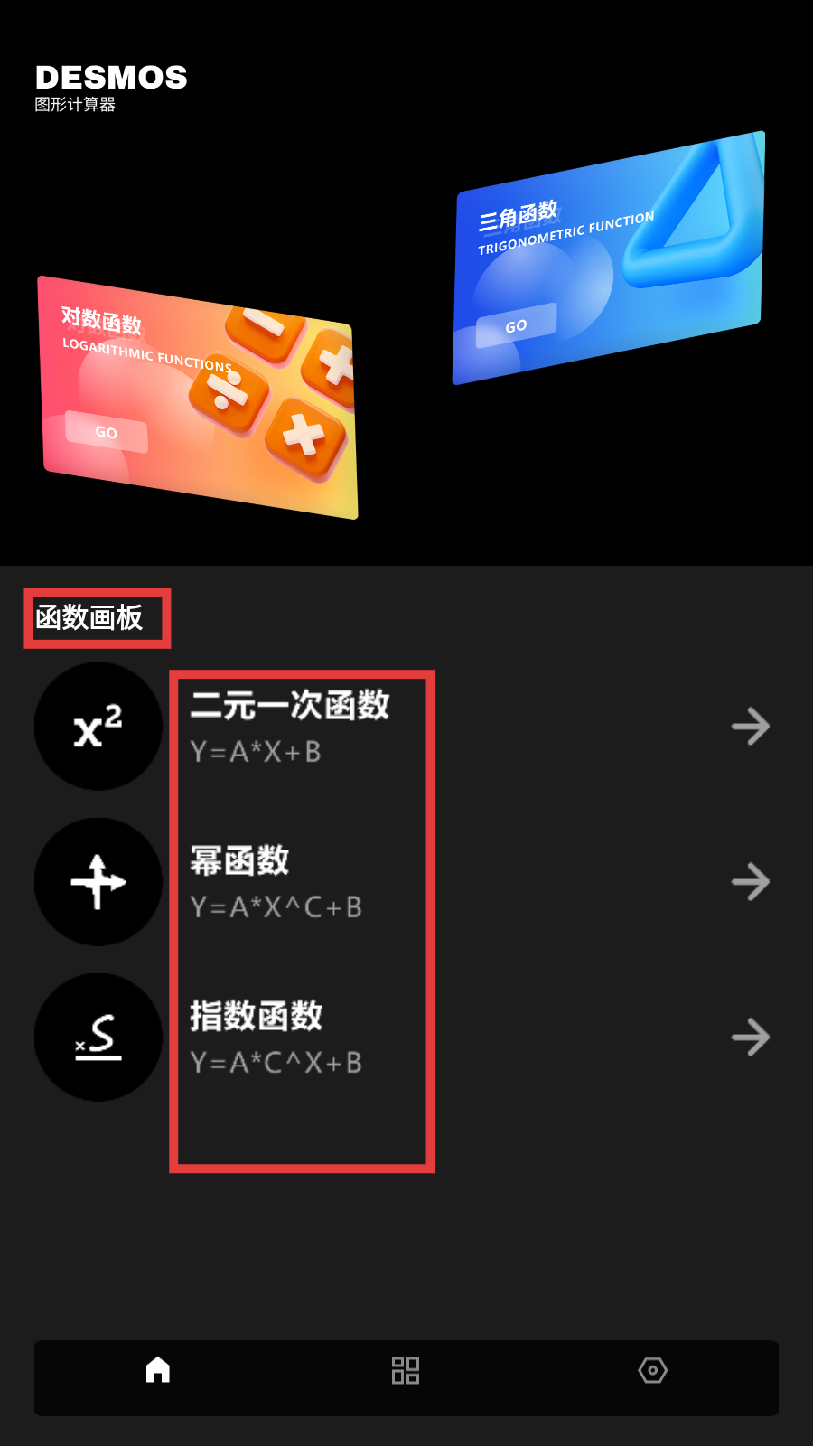 1、打开【Desmos函数绘图】应用,在【函数画板】中选择函数类型,如【二元一次函数】【幂函数】【指数函数】等。