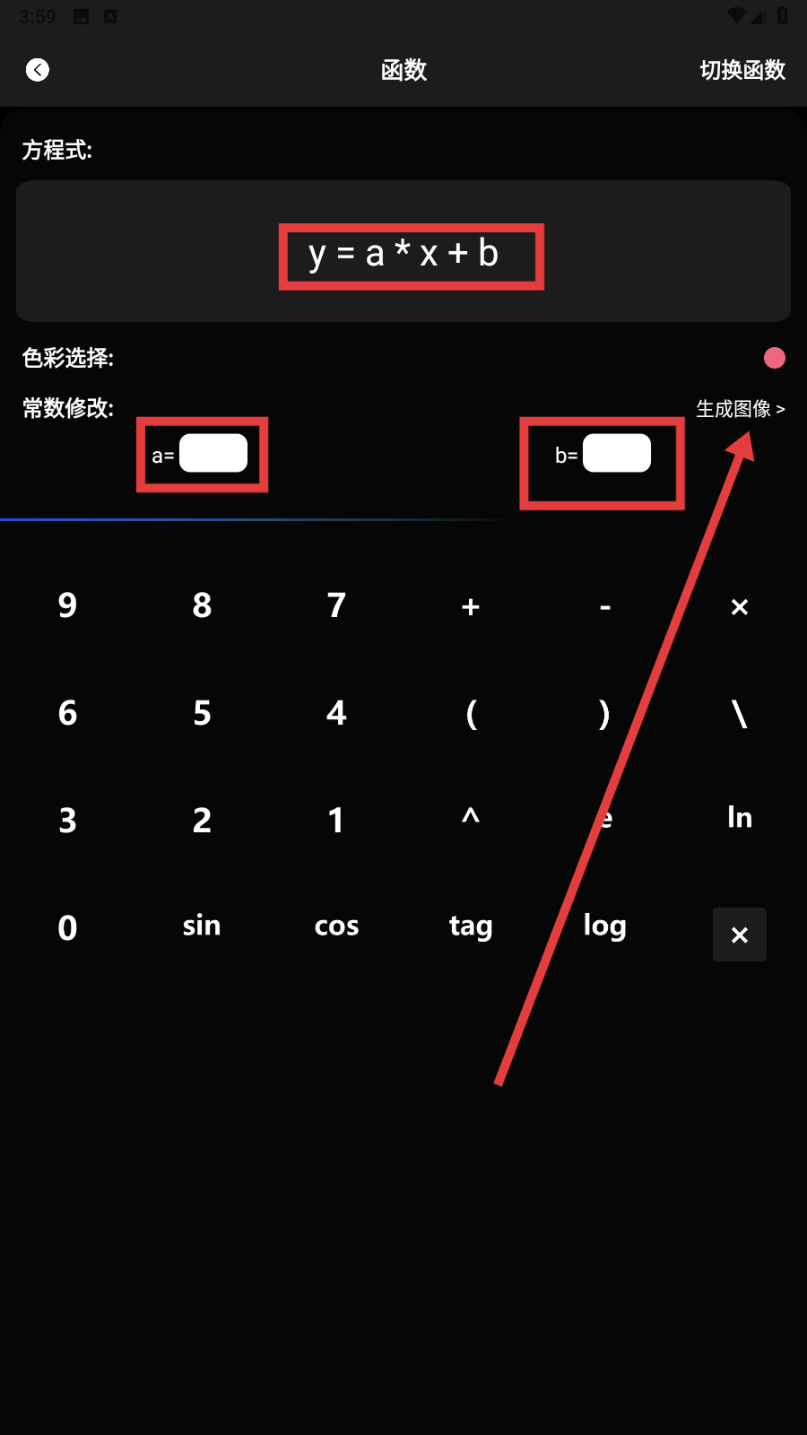 2、以【二元一次函数】为例,在【方程式】输入框中输入【y=a*x+b】,通过数字键盘修改【a】和【b】的常数,点击【生成图像】。