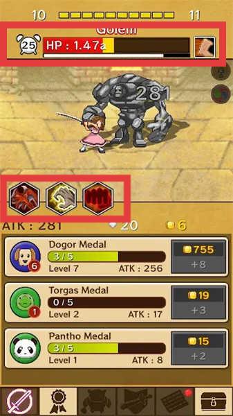 2、面对敌人【Golem】时,依据其【HP】数值选择合适技能应对。