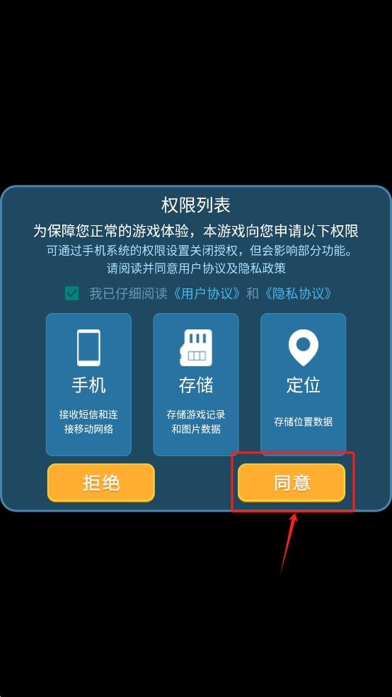 1、同意权限请求:在游戏启动时,勾选同意并点击“同意”按钮以授权游戏所需的权限。
