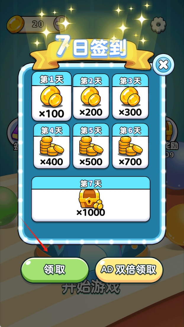 1、点击“领取”按钮获取每日签到奖励。此步骤帮助新手快速获取游戏内货币,增加游戏资源。