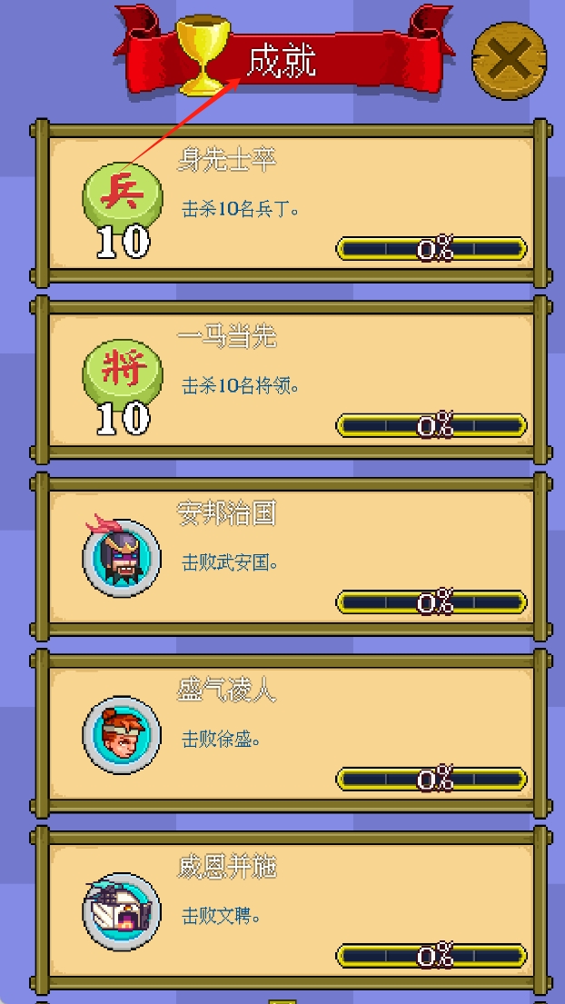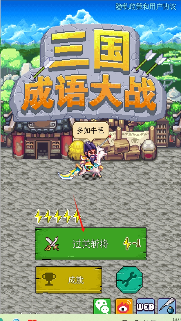 1、点击“过关斩将”进入游戏。此步骤帮助新手快速开始游戏,体验三国成语挑战。