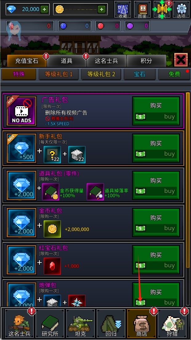 3、进入商店购买道具和礼包。此步骤为新手提供获取额外资源和道具的途径,增强游戏体验。