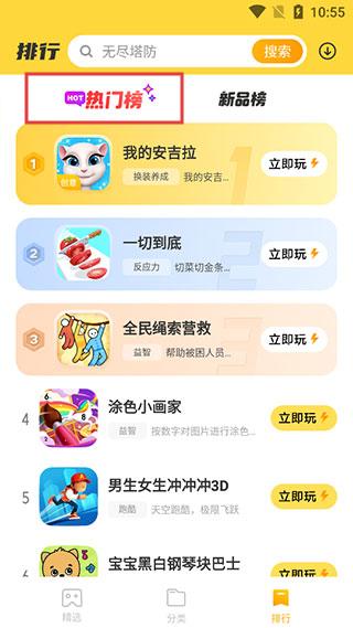 3、在【排行】页面,查看【热门榜】选择热门游戏直接游玩。
