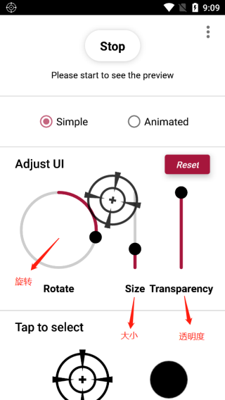 2、通过【Rotate】【Size】【Transparency】调整准星参数。