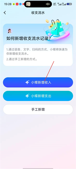 3、在收支流水页面,点击【小蝶新增收入】按钮,触发AI识别流程。