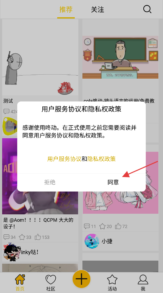 1、打开咚动APP,点击【同意】接受用户服务协议和隐私权政策。