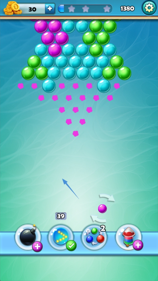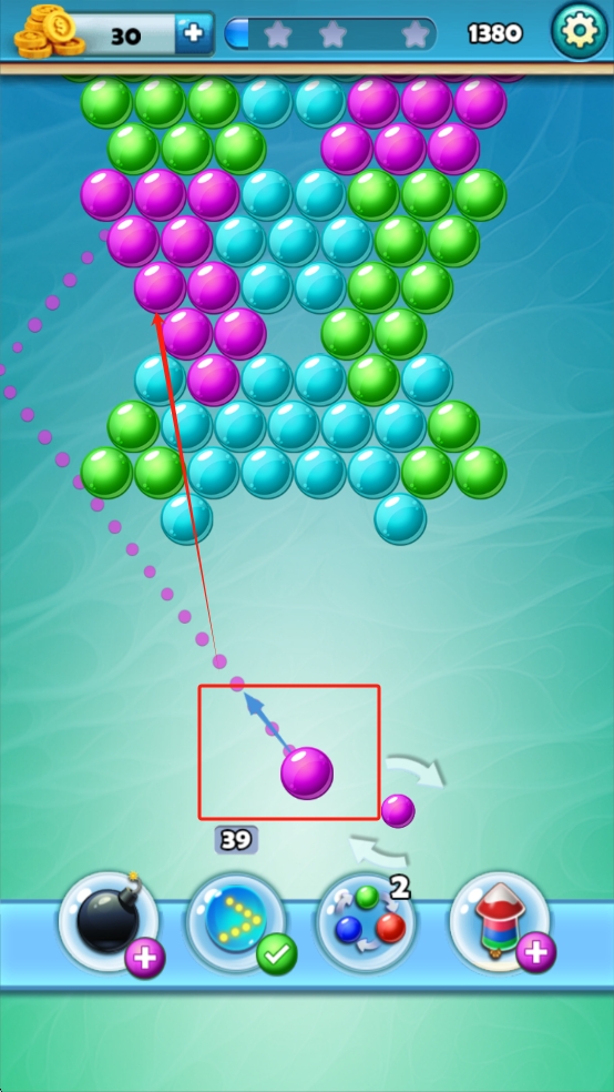2、策略规划路线:根据场上泡泡布局,提前规划发射路径,利用反弹原理消除更多泡泡,获取更高分数。