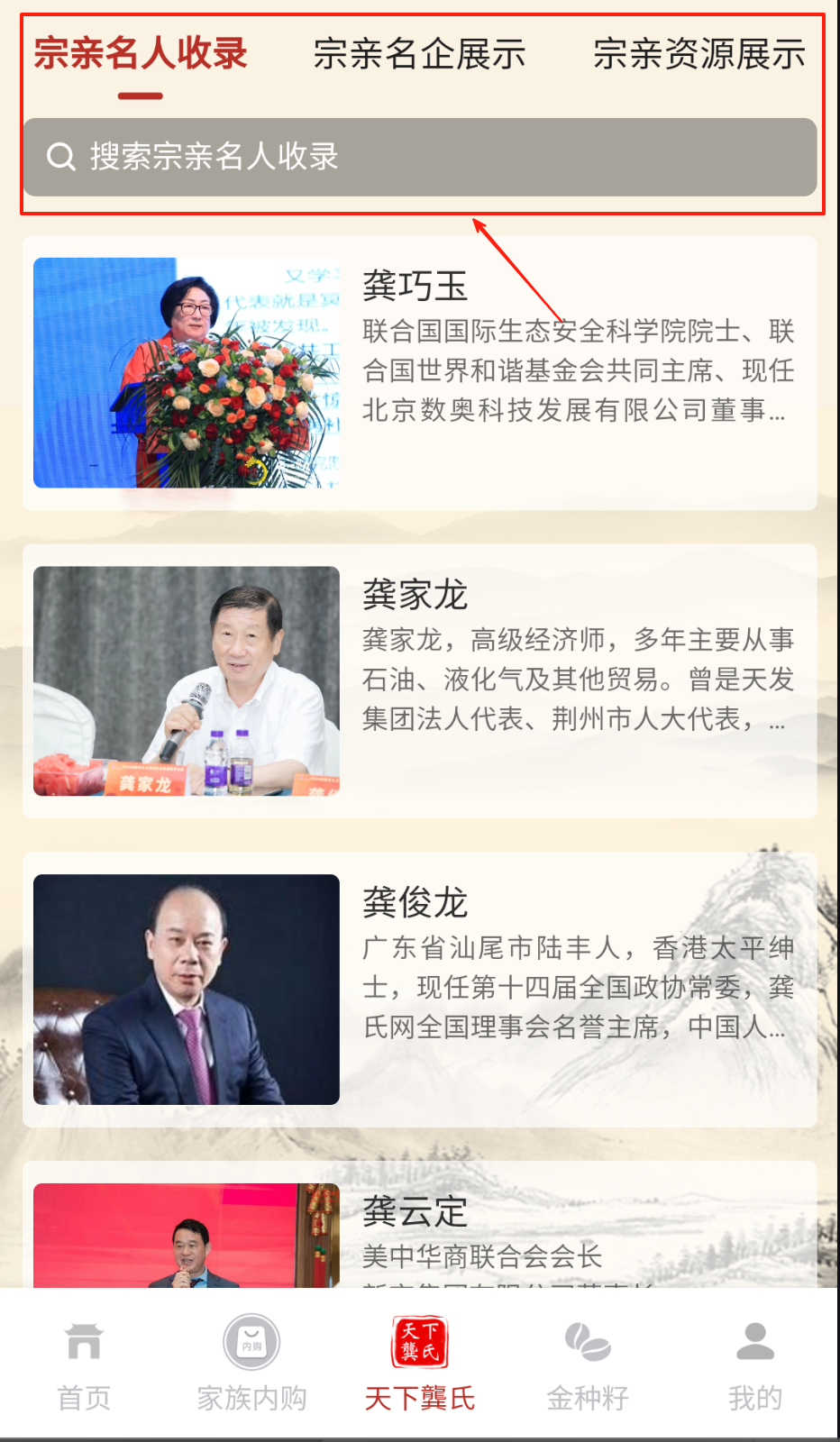 2、主界面分栏浏览宗亲热力图、古今名人录、企业黄页等核心模块,点击详情页可查看图文解说。