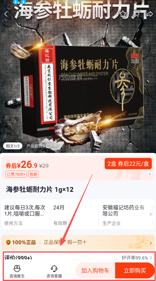 4、查看商品详情时,例如海参牡蛎耐力片,页面会展示产品说明、券后价格、销量、使用方法、生产企业等信息。