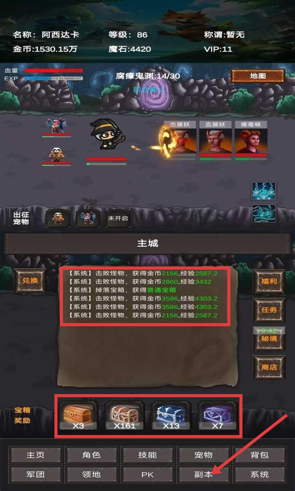 1、在战斗中击败怪物可获得金币与经验(如【系统】提示所示),留意屏幕下方【宝箱奖励】及时收集资源,提升角色实力。