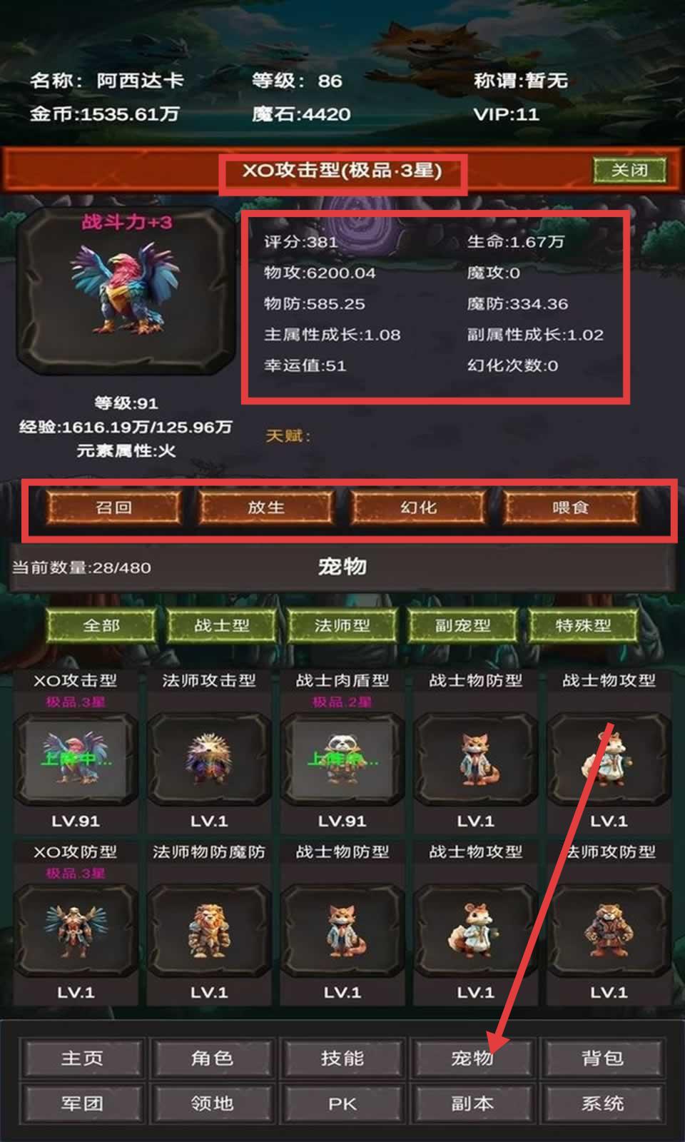 2、进入【宠物】界面,查看宠物属性(如【XO攻击型(极品·3星)】),通过【召回】【放生】【幻化】等操作管理宠物,增强战斗能力。