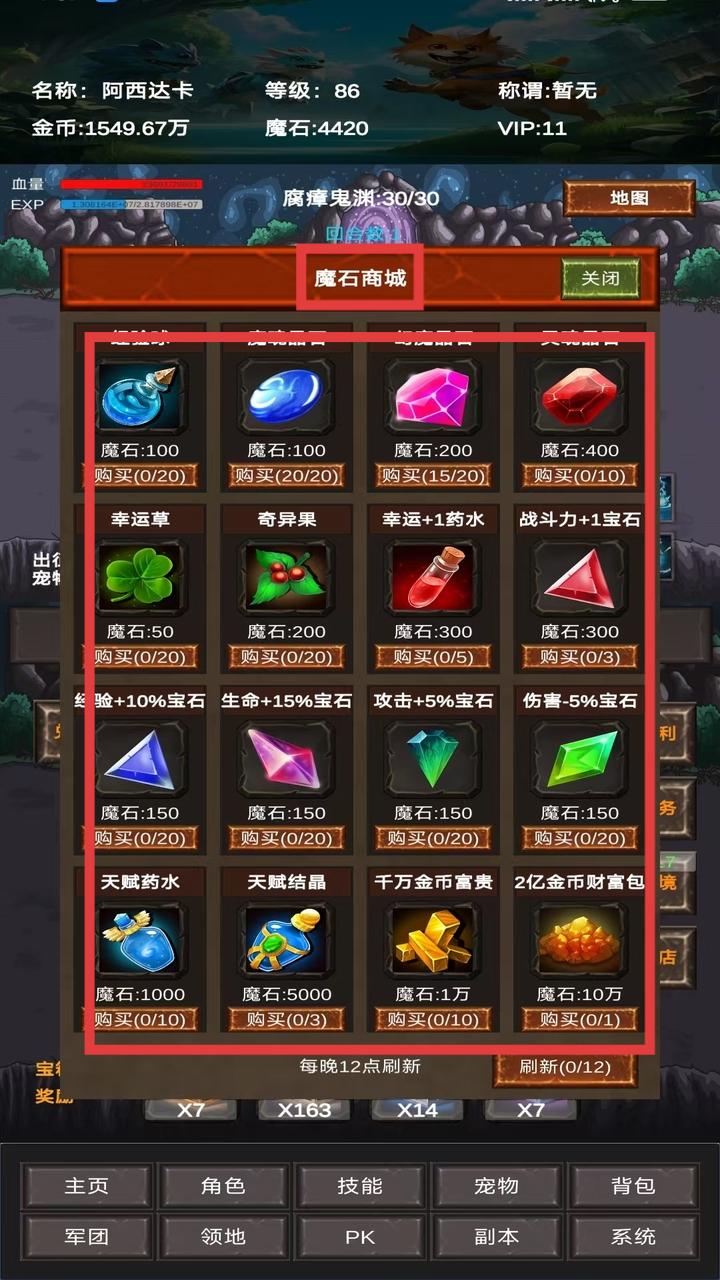 3、打开【魔石商城】,根据需求用魔石购买道具(如【幸运草】【战斗力+1宝石】等),合理利用资源提升角色与宠物属性。