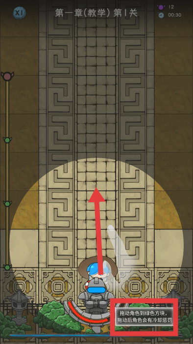 1、在【第一章(教学)第1关】中,按提示拖动角色到绿色方块,注意拖动后角色会有冷却惩罚,合理规划移动时机。