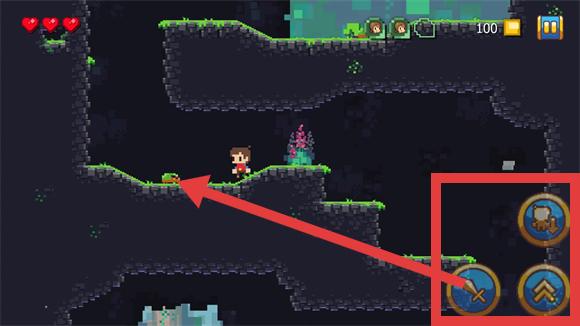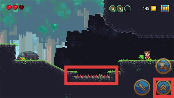 2、面对红色尖刺陷阱,点击右下角【跳跃按钮】(向上箭头图标),操控角色跳过尖刺,避免受到伤害。