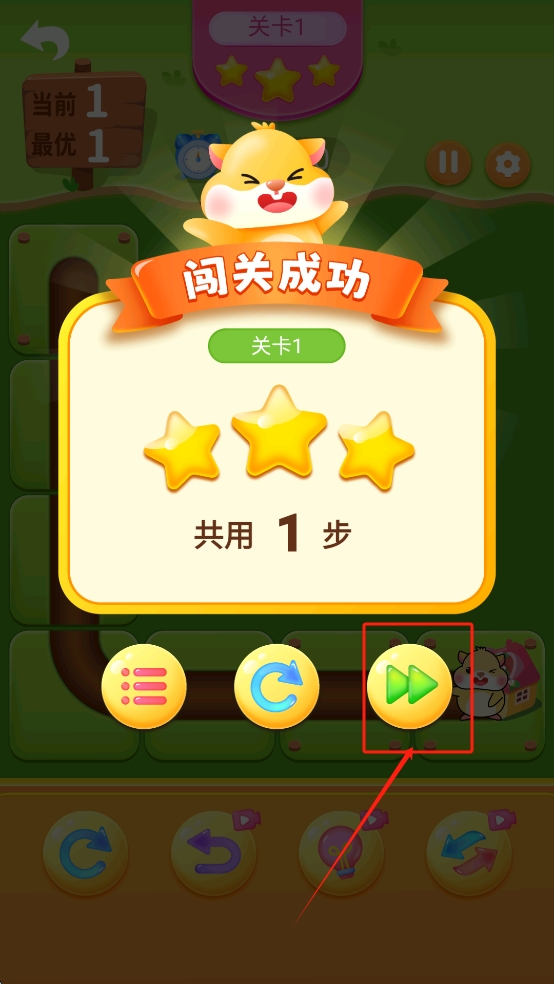 3、结束并查看成绩:完成关卡后,游戏会显示您的闯关成绩,点击播放按钮可以再次挑战或进入下一关。