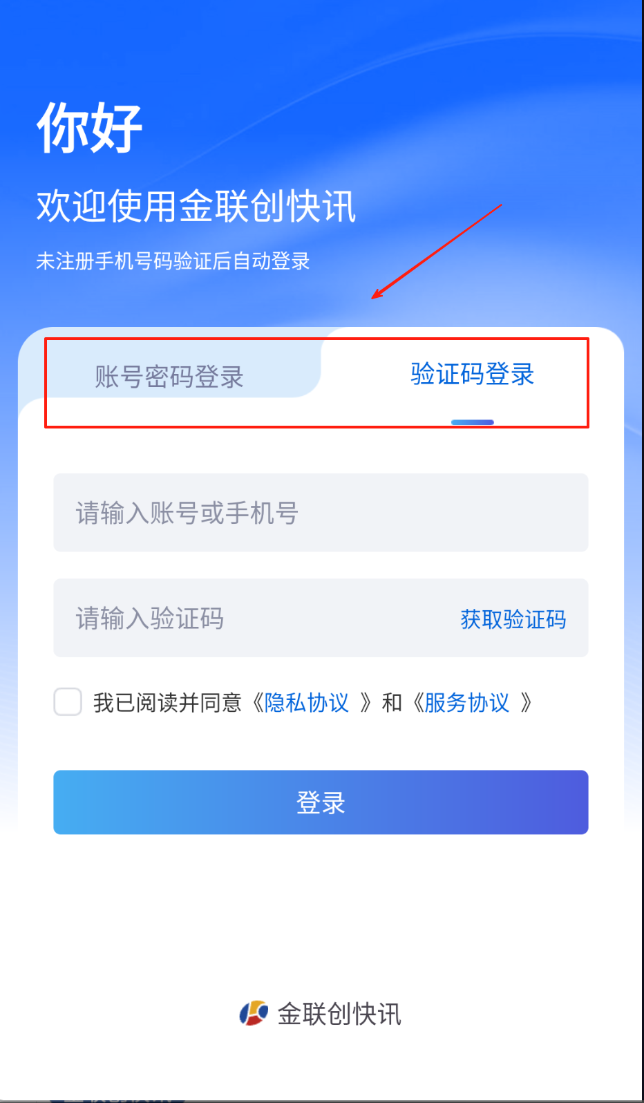 1、打开软件,中间选择验证码或账号密码登录方式,输入手机号记得带区号,点击获取短信验证码,收到后填入数字。