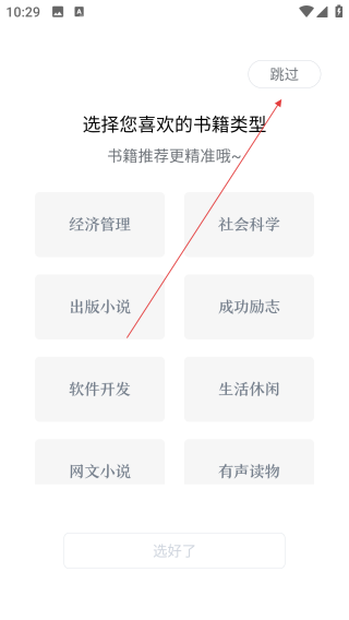 1、打开京东读书手机,点击【跳过】。