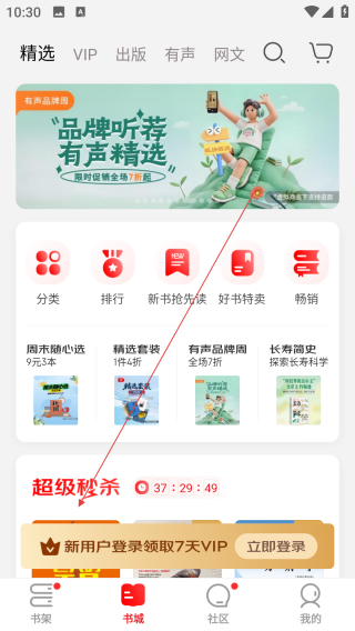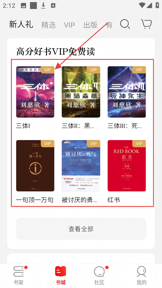 1、在书城,能看到【高分好书VIP免费读】板块,里面有《三体》等优质作品,快选喜欢的点进去吧。