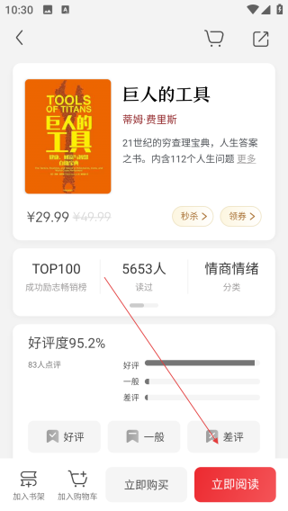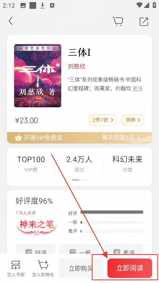 2、进入《三体I》详情页,能看到价格、好评度等信息,点击【立即阅读】,就能开始阅读啦。