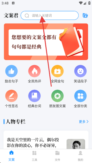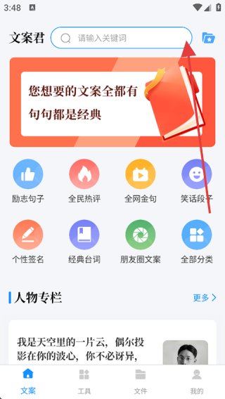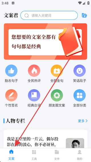 文案君是整合海量优质文案与智能创作工具的多功能文字服务平台,旨在为用户解决文案创作难题,提供从素材获取到内容生成的全流程支持。它汇聚经典台词、励志金句、朋友圈爆款文案等多元内容,搭配语音转文字、图片识别、多语言翻译等实用工具,无论是社交动态发布、灵感收集,还是跨语言创作需求,都能在此找到高效解决方案,助力用户轻松驾驭文字表达,提升内容创作质量与效率。