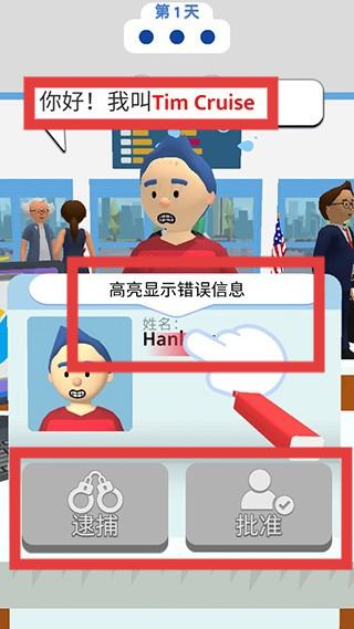 1、留意角色信息,如【TimCruise】,并关注高亮显示的【错误信息】,据此选择【逮捕】或【批准】操作。