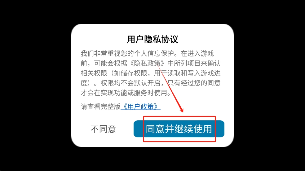 1、同意隐私协议:在游戏启动时,阅读并点击“同意并继续使用”按钮以接受隐私政策,从而开始游戏。