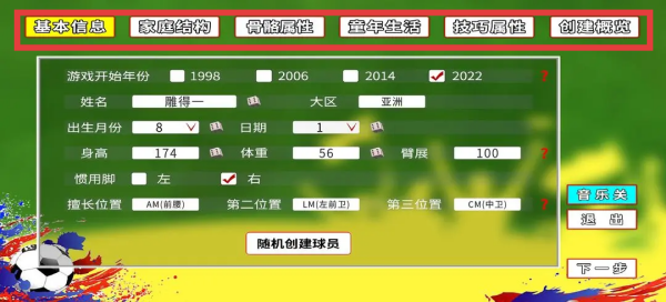 1、在创建球员界面,根据需求设置【基本信息】,如选择游戏开始年份、填写姓名等,也可使用【随机创建球员】功能。