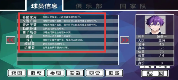 2、查看球员的【技巧属性】,如【补贴家用】【交游广阔】等,利用这些属性提升球员能力和获取额外特性。