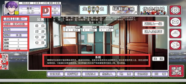 3、合理安排球员日程,如进行【技巧训练】,注意公寓客房情况,确保有客房才能招聘职员、邀请传奇,获取每周经验。