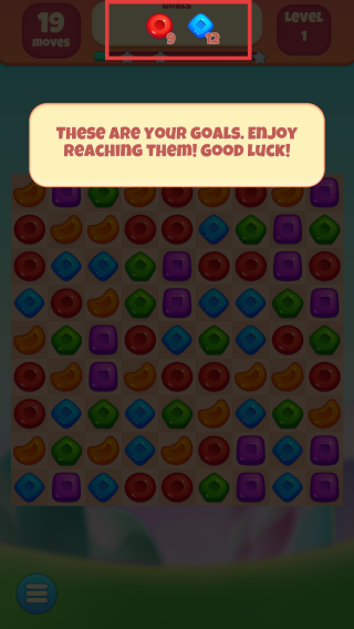 2、关注关卡目标,如收集指定数量的【红色】和【蓝色】糖果,按要求完成任务。