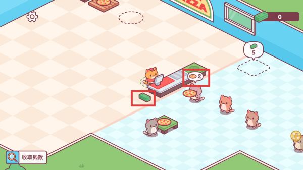 3、留意屏幕上的金钱标识和顾客需求,如顾客头顶的披萨标识和数字,及时【收取钱款】。