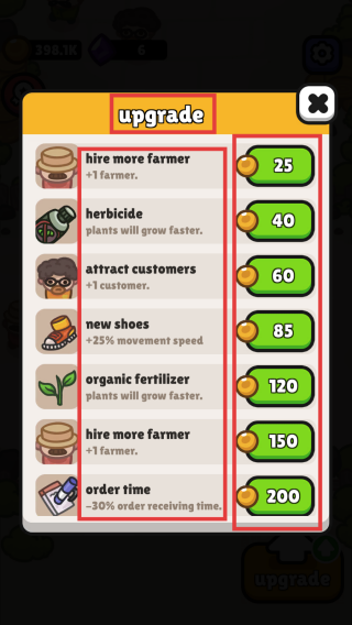 3、进入【upgrade】升级界面后,根据金币数量和游戏需求选择升级项目,前期可优先选择【hiremorefarmer】增加农民数量来提升生产效率。