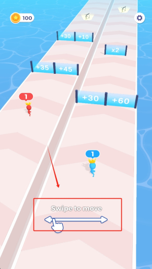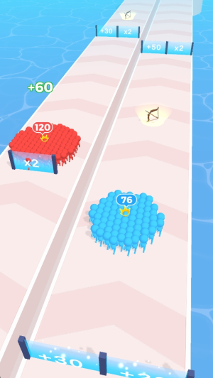 1、进入游戏后,滑动屏幕操控初始小人在赛道上移动,沿途收集散落的小人,不断扩充队伍规模。