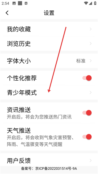 2、在设置页面,点击【青少年模式】选项,可进入青少年模式设置界面。