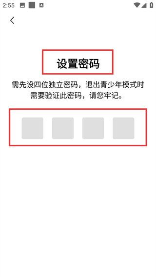 4、在设置密码页面,设置四位独立密码,即可成功开启青少年模式,享受适龄内容推荐。