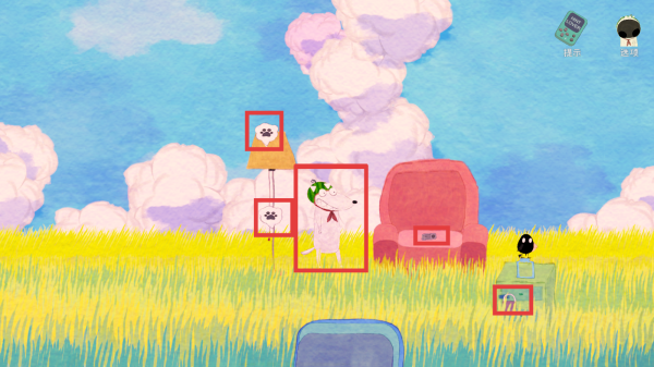 1、关注场景中红框标记的元素,如带有爪印图案的物件、小狗等,可能是关键互动点,尝试点击探索。