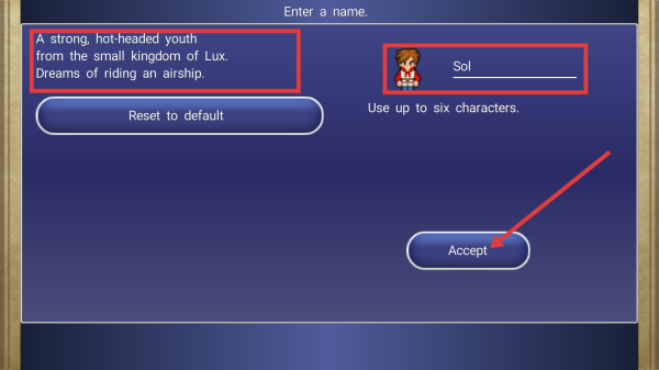 2、创建角色时,根据角色背景描述选择心仪角色,输入名字(如【Sol】)后点击【Accept】确认。