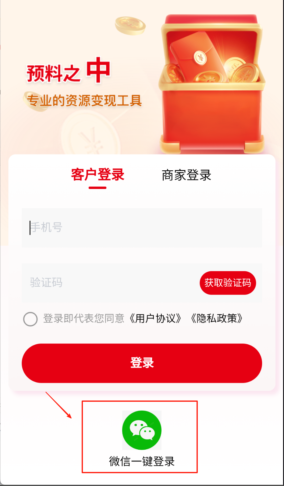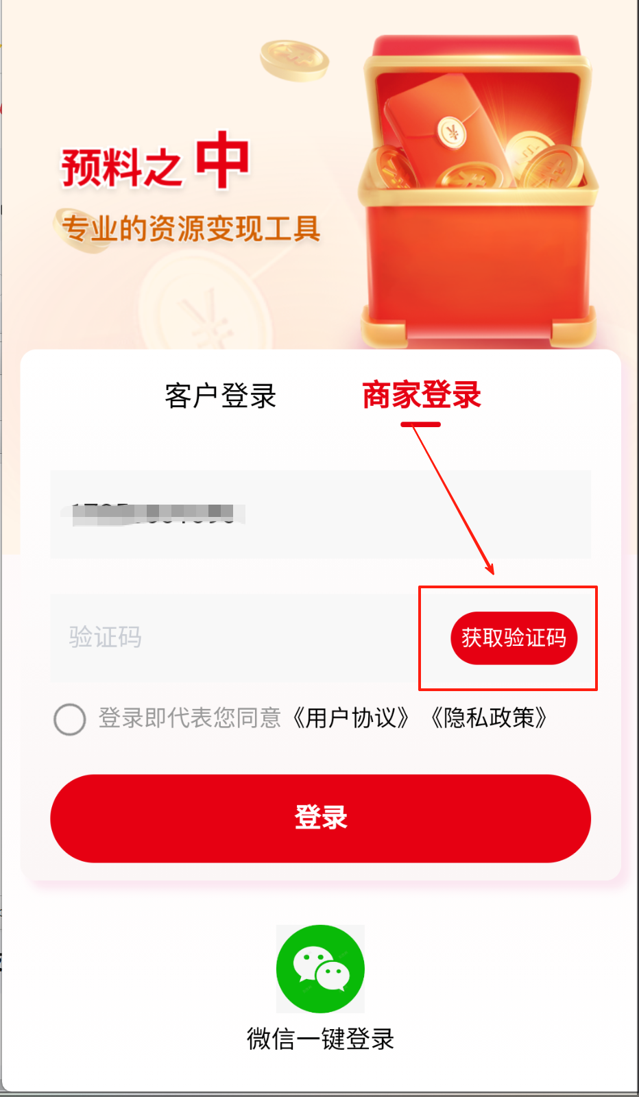 2、输入手机号后点红色"获取验证码",填完验证码别忘勾选底部协议框,最后戳大红"登录"按钮。