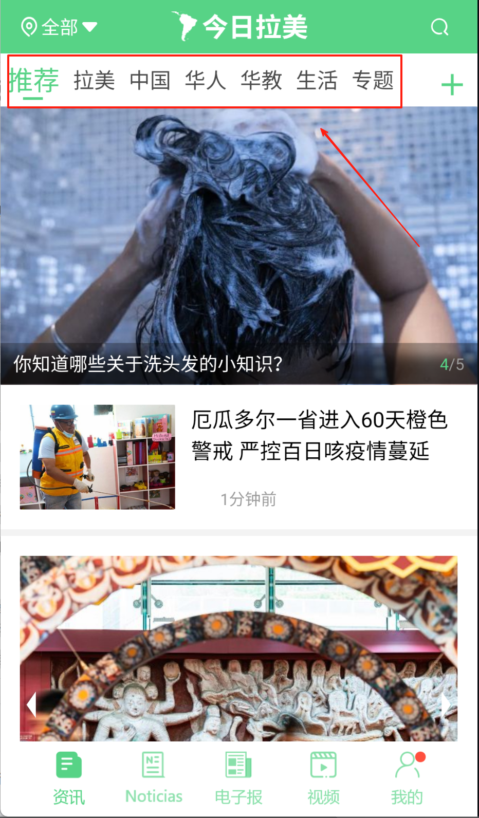 1、首页基于用户兴趣推送实时热点,通过左右滑动触控切换拉美政经要闻及中拉合作动态专题栏目。