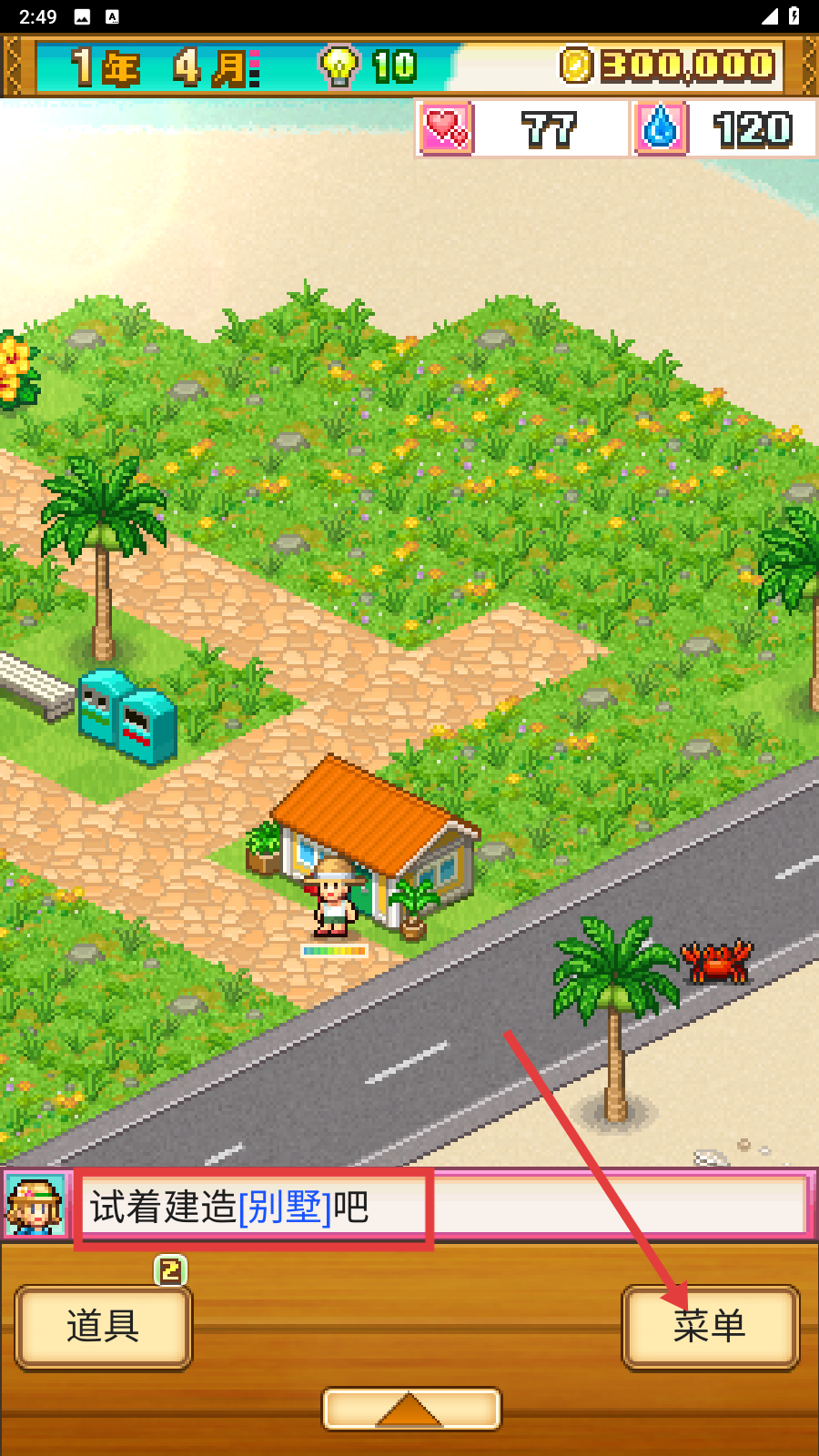 1、游戏中收到【试着建造[别墅]吧】提示时,点击屏幕下方【菜单】按钮,进入功能菜单。