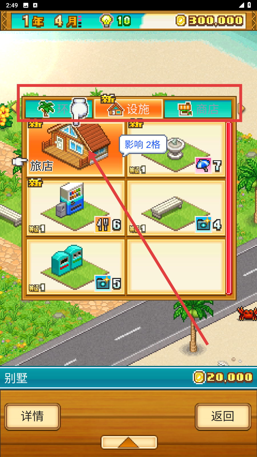 2、在菜单中选择【设施】选项,打开设施建造界面,浏览【环境】【设施】【商店】等分类下的建筑选项。