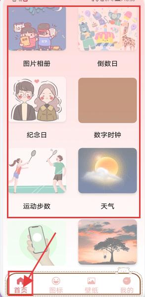 1、打开应用,点击底部导航栏的【首页】选项。长按需要添加的小组件,将其拖动到手机桌面合适位置,松开手指即可添加成功。