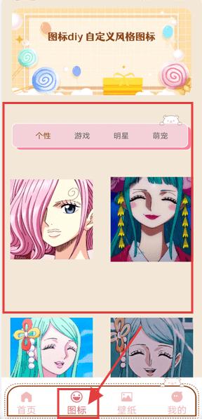 2、点击底部导航栏的【图标】选项,选择喜欢的分类,点击相应图标样式,按照提示操作,可将其应用为手机应用图标。