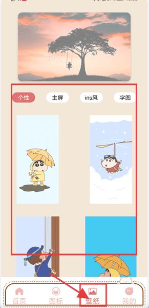 3、点击底部导航栏的【壁纸】选项,选择喜欢的风格,点击相应的壁纸图片,即可将其设置为手机壁纸。