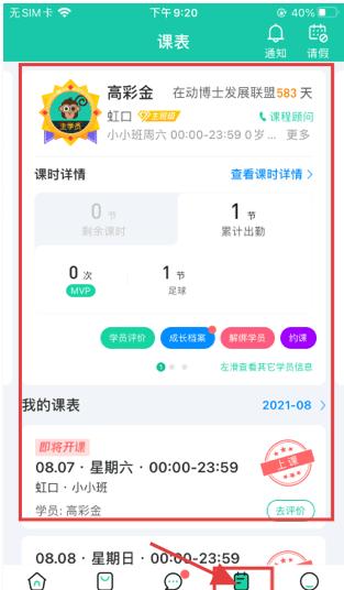 3、【课表】页面,可看到个人信息,【课时详情】处显示剩余课时、累计出勤等数据。下方【我的课表】展示具体课程安排。