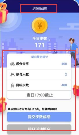 1、在应用的【步数挑战赛】板块,查看【今日步数】。若想参与,需在当日17:00截止前,点击【提交步数成绩】上传当日步数参赛。