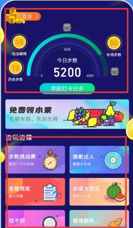 2、打开运动界面,查看【今日步数】。可点击【早起打卡计步】参与打卡。还能参与【免费领水果】活动。